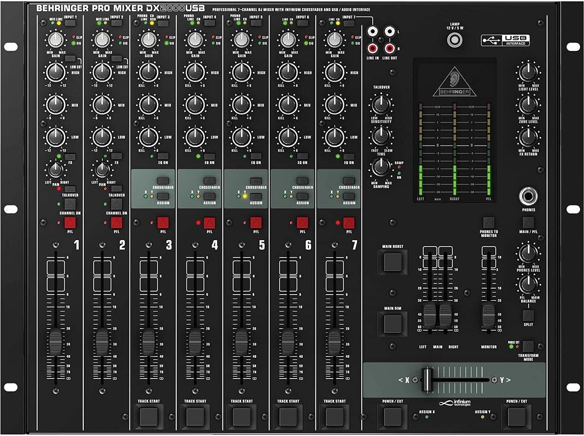 Table de mixage Pro Mixer DJ 7 voies avec interface audio USB, crossfader à VCA et un ensemble complet de logiciels. Table large, 5 entrées Dual Stereo et 2 voies micro/ligne avec préamplificateurs à bonu de bruit ultra faible, alimentation fantôme, réglage de gain et voyant Clip. 3 préamplificateurs phono intégrés pour connecter 3 platines. L'interface USB permet de connecter la bibliothèque musicale de vote ordinateur à la table. Celle-ci inclut également toutes les fonctionnalités de base d'une table de mixage. Faders Ultraglide contrôlés supportant jusqu'à 500000 cycles, crossfader optique à VCA pour une fiabilité exceptionnelle et un son irréprochable. Égaliseur Kill 3 bandes.